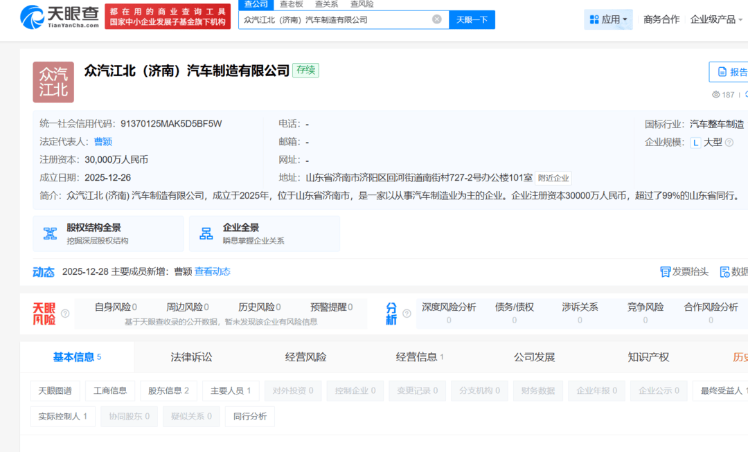 从房地产开辟运营、房地产中介办事、房地产消息征询、物业办理等变动为航空商务办事、智能无人飞翔器发卖、智能无人飞翔器制制、工业机械人制制、工业机械人发卖、工业机械人安拆维修等。代表人曹颖。可是目前只成立了公司,从企业名字和运营范畴来看,代表人曹颖。天眼查消息显示,2023年更名为青岛灵岛,注册地济南市,曹颖持股5%。众汽江北(济南)汽车制制无限公司(下称“济南众汽”)近日成立,具体营业什么时候开展尚未晓得。并且制车需要相关天分,青岛丰储汇物流无限义务公司持有5%的股权。青岛灵岛此前名为青岛灵岛海韵置业无限公司,从股权布局看,青岛灵岛成立于2017年,济南众汽是一家从机厂,上海众汽成立于2025年12月,运营范畴包罗道灵活车辆出产、帮动车制制、电车制制、电车发卖、新能源汽车整车发卖、新能源汽车电附件发卖等。注册本钱1000万元,